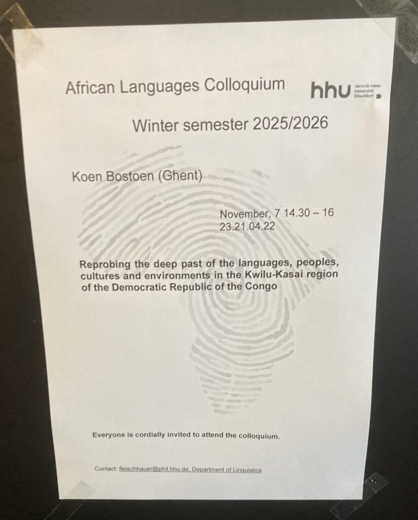 On November 7, 2025, Koen Bostoen (BantUGent) gave a talk titled “Reprobing the deep past of the languages, peoples, cultures and environments in the Kwilu-Kasai region of the Democratic Republic of the Congo” at the African languages colloquium of the Heinrich-Heine-University in Düsseldorf.